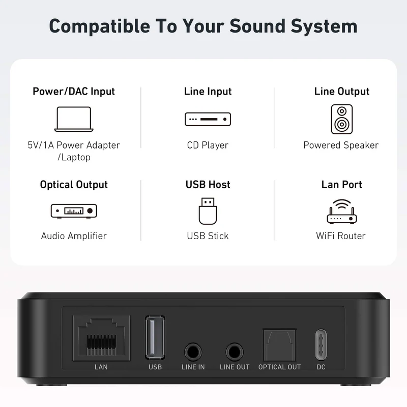 - 🎶Play Any Music You Like: Compatible with a wide range of online music services, including Spotify, Amazon Music, Tidal, Qobuz, TuneIn, Internet Radio, iHeartRadio, Napaster, etc. In addition, it also supports advanced wireless streaming technology. Such as AirPlay, Spotify Connect, DLNA and UPnP, allowing you stream from NAS or play music directly from iOS devices or Spotify APP, provide flexible multi-platform compatibility.